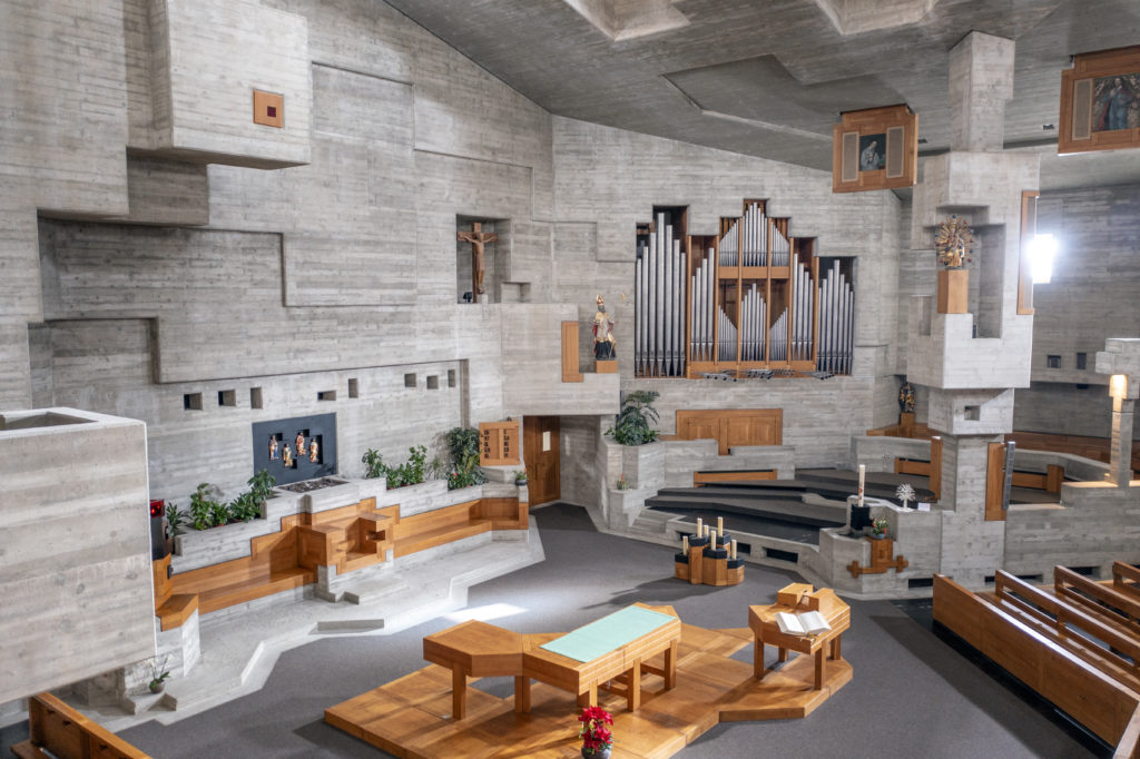 Le projet qui fut choisi est celui de l’architecte Walter Föderer qui a imaginé, dans la cuvette réservée à la construction, un rocher tombé à cet endroit. Dans ce rocher, il a sculpté une église en lui donnant les formes découpées et irrégulières qu’imposent le terrain.