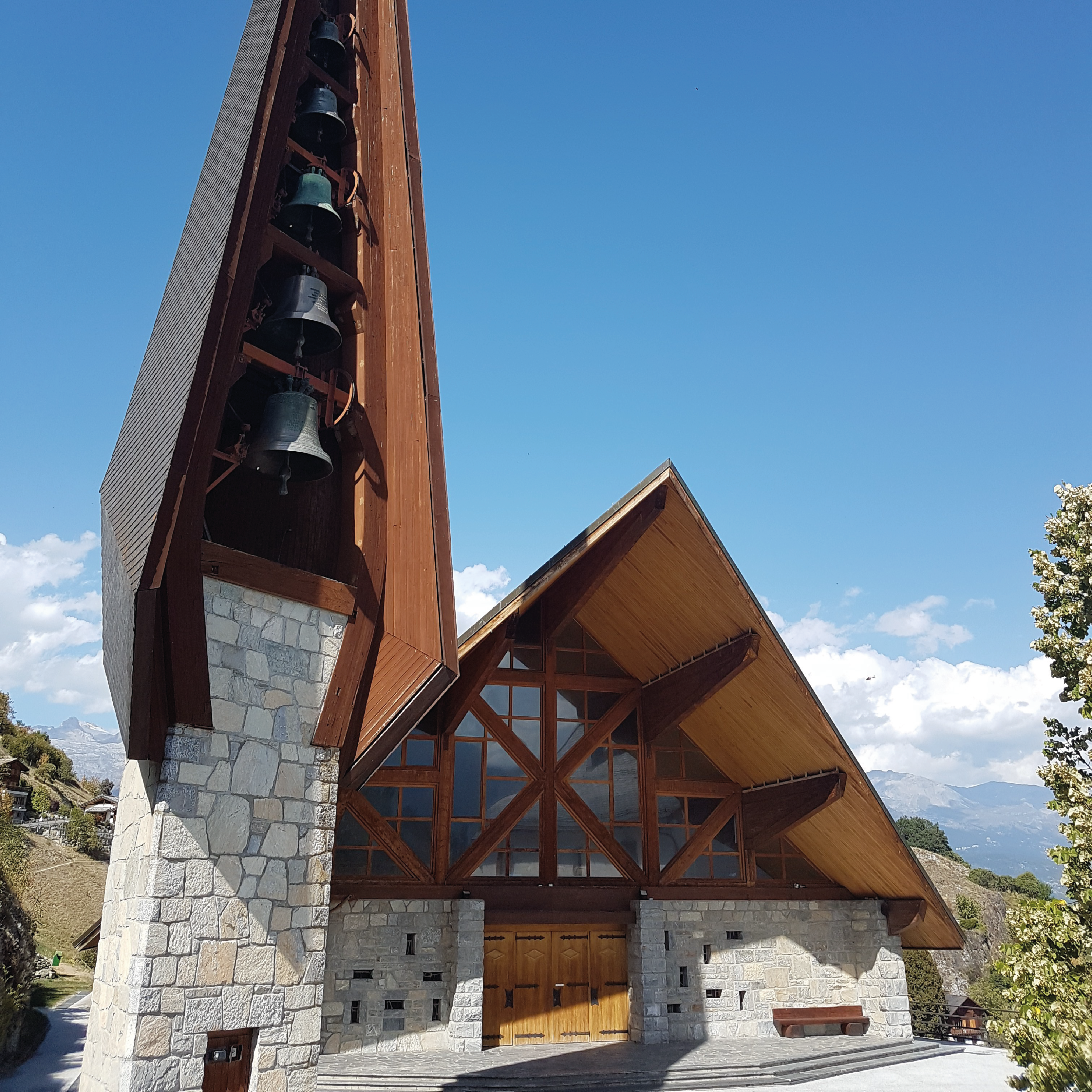 Un vaste toit à deux pans comme des ailes protectrices, le bois comme arêtes pour le soutenir, un mur de pierres apparentes au choeur, une grande baie vitrée, tout cela constitue une architecture forte à la fois ouverte sur les monts et sur les âmes.